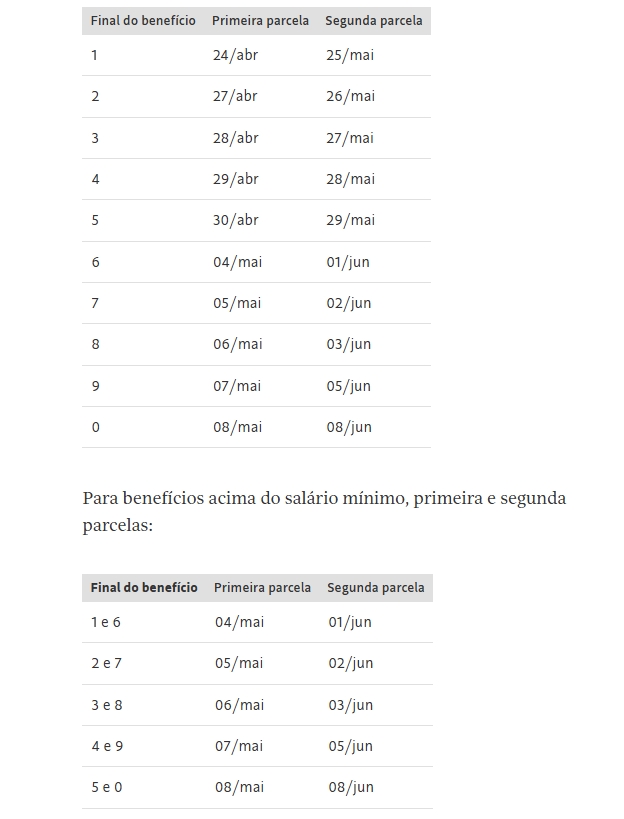 Para benefícios iguais ao salário mínimo, primeira e segunda parcelas: