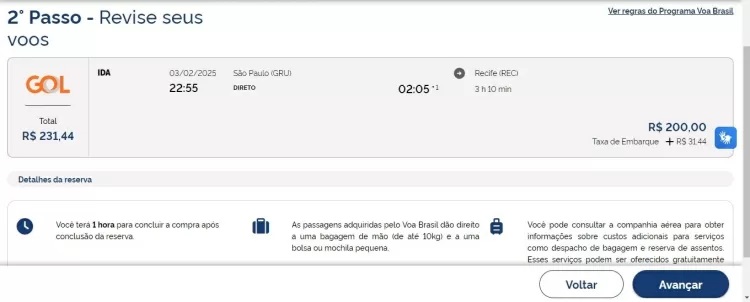 Imagem: Reprodução Voa BrasilApós a escolha do voo, aparece uma tela para revisão dos dados. Lá, o site avisa que o aposentado tem uma hora para completar a compra e que as passagens dão direito a uma mala de mão de até 10 quilos.