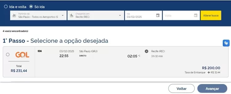 Para testar o sistema, o UOL simulou dois voos. O primeiro deles para o dia 3 de fevereiro de 2025 saindo do aeroporto de Guarulhos, em São Paulo, para Recife, pela Gol, às 22h55. A passagem, de ida, custaria R$ 231,44, já com a cobrança da taxa de embarque. O mesmo voo custa R$ 831,34 pelo site normal da Gol.