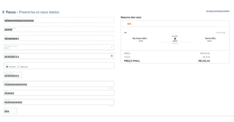 Imagem: Reprodução/ Voa BrasilO próximo passo é preencher os dados pessoais. Não é possível mudar o nome do beneficiário, já que o acesso ao site é feito por meio da conta gov.br. É preciso preencher informações como data de nascimento, e-mail e endereço. Ao confirmar, o aposentado é novamente informado de que tem uma hora para efetuar o pagamento, caso contrário perderá a reserva.