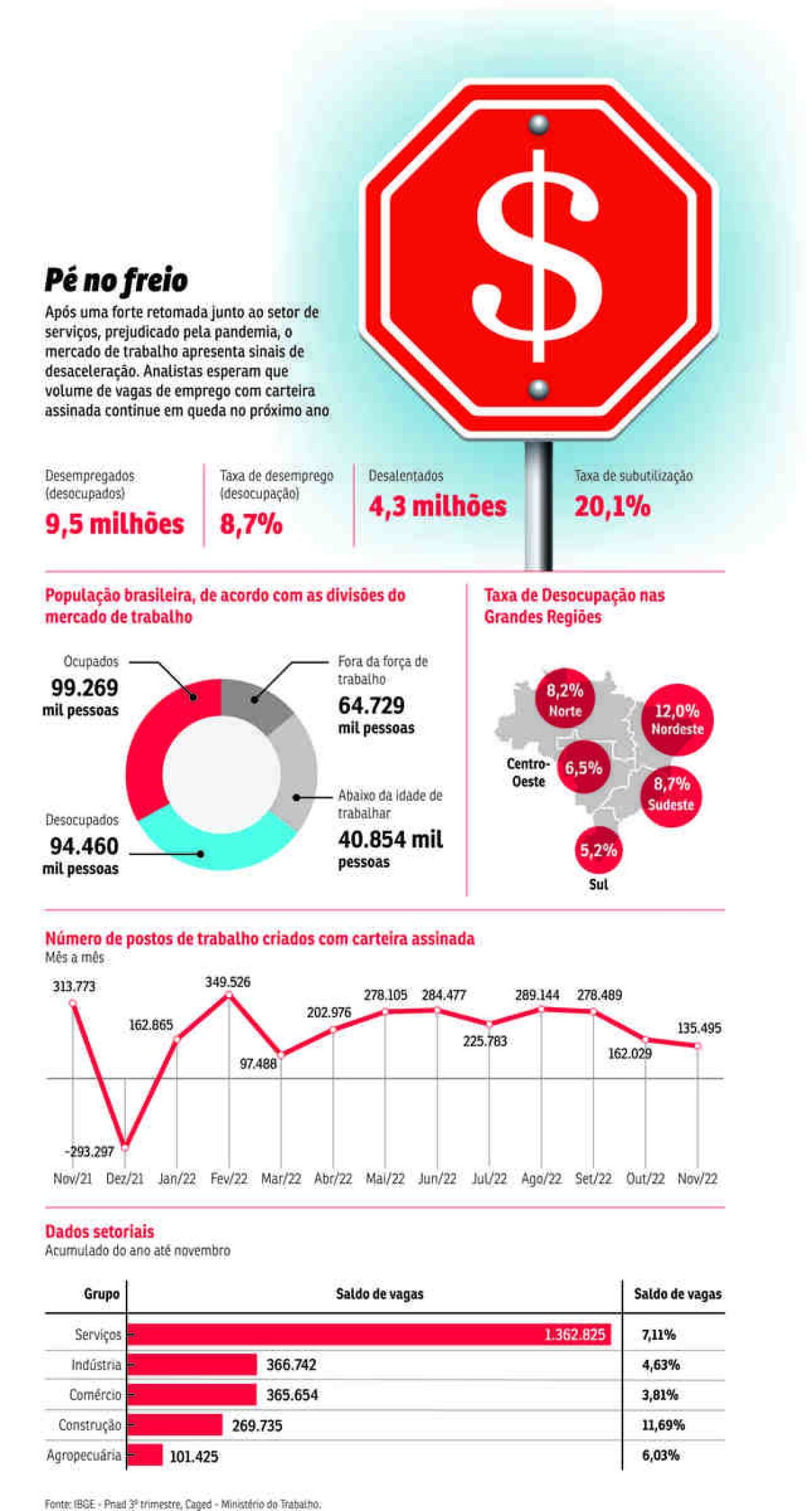 A desaceleração nas contratações se mostrou disseminada entre os setores da agropecuária, indústria e construção, enquanto comércio e serviços seguem se destacando devido à uma recuperação da pandemia, somados à sazonalidade do período de fim de ano. De acordo com os analistas, a desaceleração no número de contratações se dá por uma estabilização das vagas perdidas nos últimos dois anos, além de um menor ritmo de crescimento da economia, que deve perdurar ao longo de 2023.